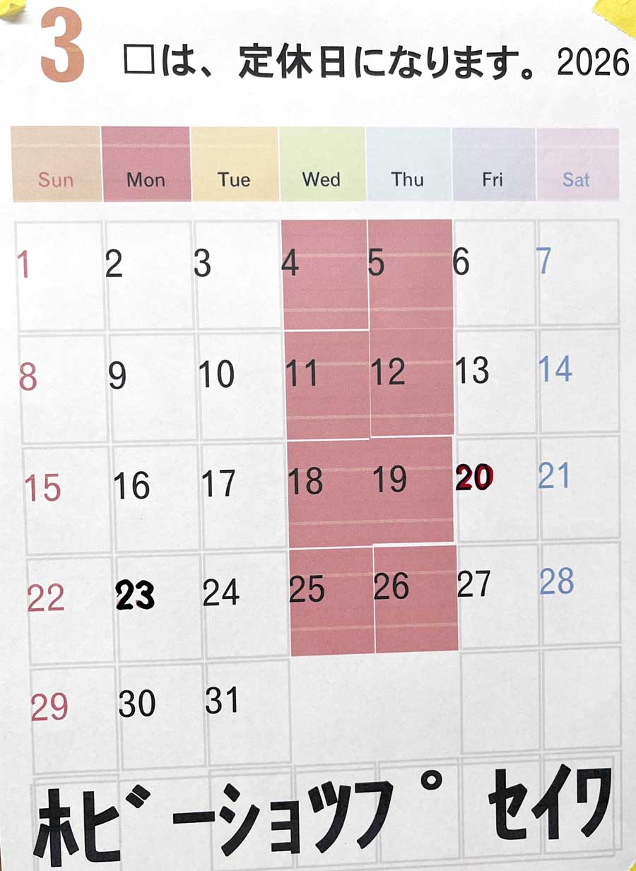 2026年3月定休日カレンダーです。